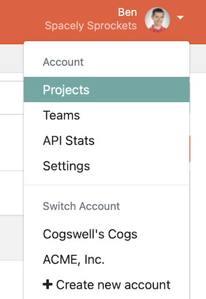 Accounts are the primary billing entities in Honeybadger. An account is created for you when you first sign up, unless you are signing up as a result of being invited to another user's account. You can create additional accounts and switch between accounts using the dropdown in the navigation bar.