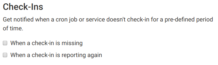 When your check-in goes missing, we'll notify you with information about which job failed to report on time. You can enable or disable these notifications along with the rest of the notification events in your Personal Alerts or Project Integrations settings.