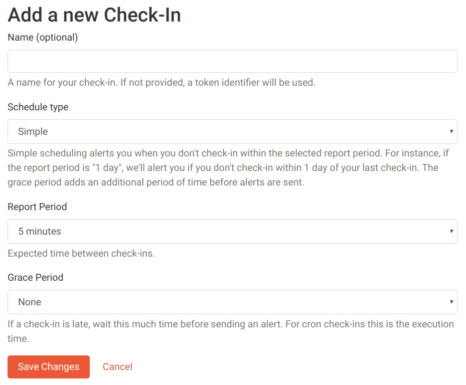 With either option you can also specify a grace period, which allows some time for long-running tasks to be completed before Honeybadger sends a notification due to a lack of reporting. For example, if you have a job that reports every hour but can take up to twenty minutes to run, you can specify a grace period of twenty minutes, and Honeybadger will allow up to one hour and twenty minutes to elapse before a notification is sent.